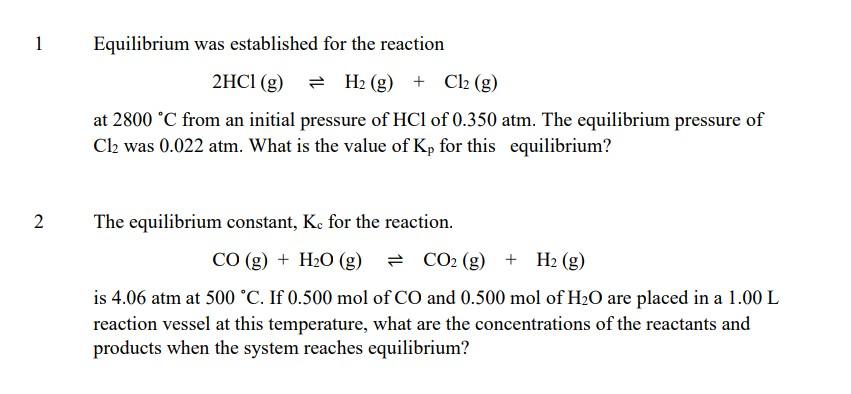 1 Equilibrium Was Established For The Reaction 2hcl Chegg